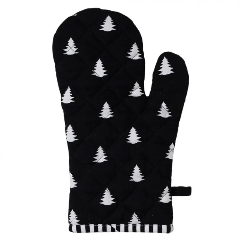 Leuke ovenhandschoen van de serie Black & White X-mas van Clayre & Eef met aan de ene kant zwart met witte kerstbomen en de andere kant wit met zwarte kerstbomen. De ovenhandschoen zorgt voor een rustige en warme sfeer in de keuken is is uiteraard praktisch in gebruik.