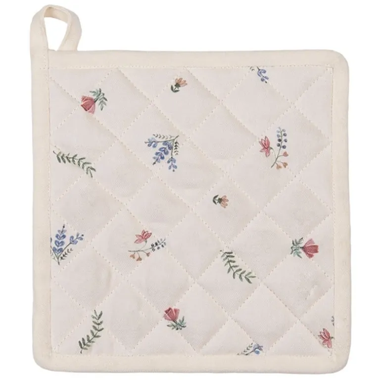 De beige katoenen stof van deze pannenlapheefteen gezelligeprint van kleine bloemetjes en een kip en haan. Super leuke textielserie voorin de landelijke keuken of eetkamer!