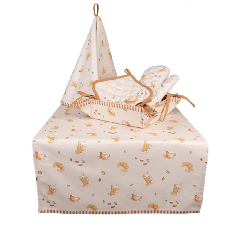 Deze textielserie Your Favourite Breakfast van Clayre & Eef is een perfecte aanvulling voor een volmaakte zondagochtend. Geniet van het klaarmaken van je favoriete ontbijt met een heerlijke kop koffie…een dag kan gewoonweg niet beter starten. Deze katoenen textielserie heeft een mooie gezellige print van croissants, kopje koffie en koffiebonen op een rustige beige achtergrond. Gecombineerd met het eigentijdse ruitpatroon maakt het deze serie helemaal af! Dek de tafel met een tafelloper met bijpassend broodmandje, of bak er op los met de matchende keukenschort, de pannenlappen en ovenhandschoenen. Met deze collectie geniet je elke dag van je favoriete ontbijt!