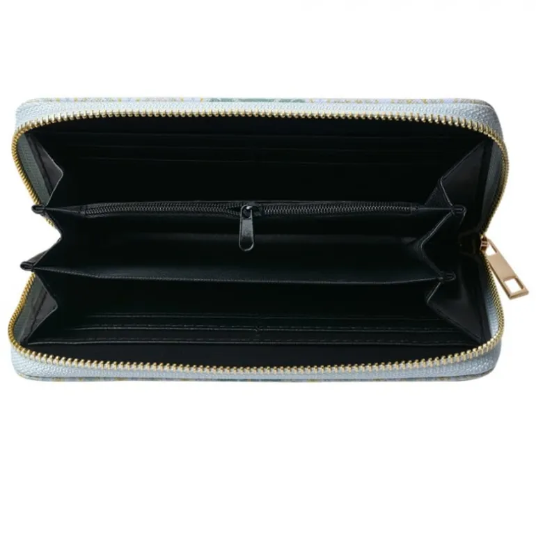 De portemonnee sluit met een goudkleurige rits en heeft 3 vakken waarvan 1 met rits. Daarbij iserveelruimte voor pasjes en je mobiel past erin!