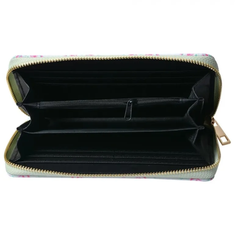 Handige en leuke portemonnee met veel opbergruimte. Gemaakt van een goede kwaliteit kunstleer met een gezelligeroze roosjesprint op een groene achtergrond. (In werkelijkheid is de kleur iets groener als op de produktfoto)