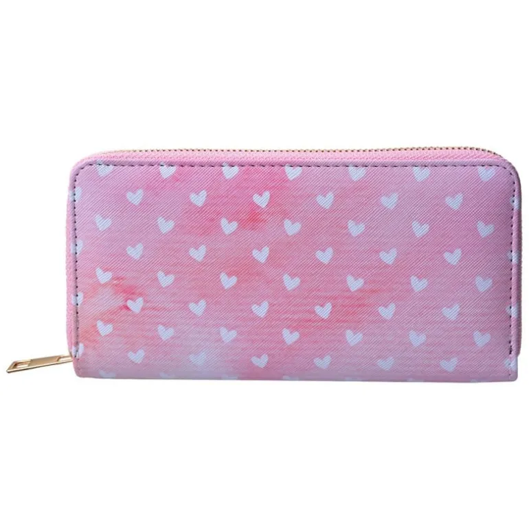 Handige en leuke portemonnee met veel opbergruimte. Gemaakt van een goede kwaliteit kunstleer met een leuke print van lieve kleine witte hartjes op een roze achtergrond.
