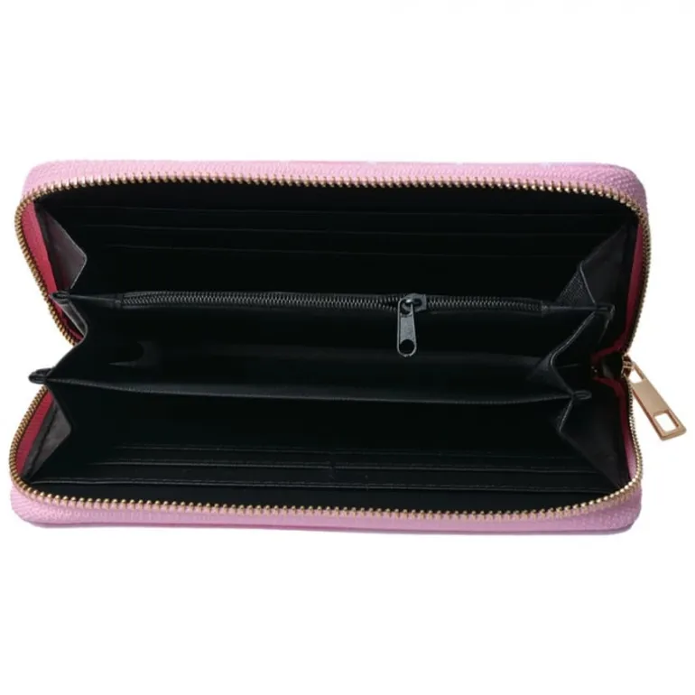 De portemonnee sluit met een goudkleurige rits en heeft 3 vakken waarvan 1 met rits. Daarbij iserveelruimte voor pasjes en je mobiel past erin!
