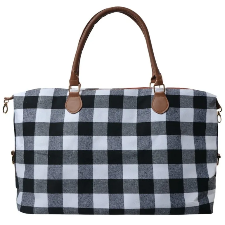 Leuke ruime zwart met witgeruite handige duffle tas, ideaal voor op reis of een weekendje weg. Handig om met de hand te dragen of met de extra draagriemover de schouder. De tas is zwart gevoerd en heeft 1 zak met rits en 2 steekzakjes aan de binnenkant zodatalles zijn eigen plek krijgt.