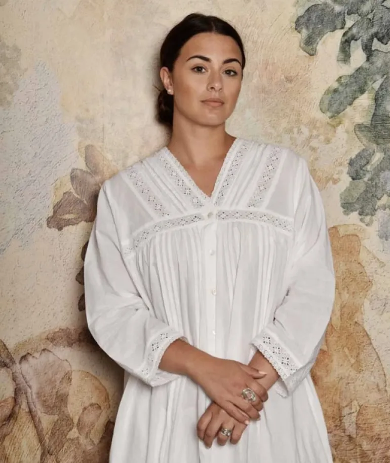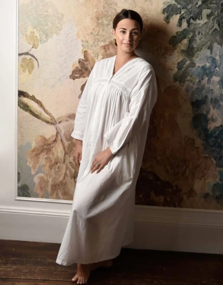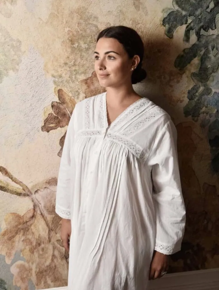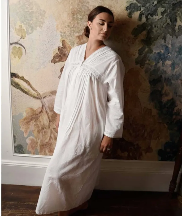 Prachtig klassiek wit katoenen nachthemd met knoopjes aan de voorkant tot taillehoogte. De lange mouwen met kanten randen zijn los en eindigen bij de pols. De v-halslijn is afgezet met kant en er zijn baneningevoegd van opengewerkt kant en speldenplooien vanaf de schouders tot een rij kant die net boven de buste loopt, wat leidt tot plooien voor volheid. Echt comfortabel en gemakkelijk te dragen stijl.