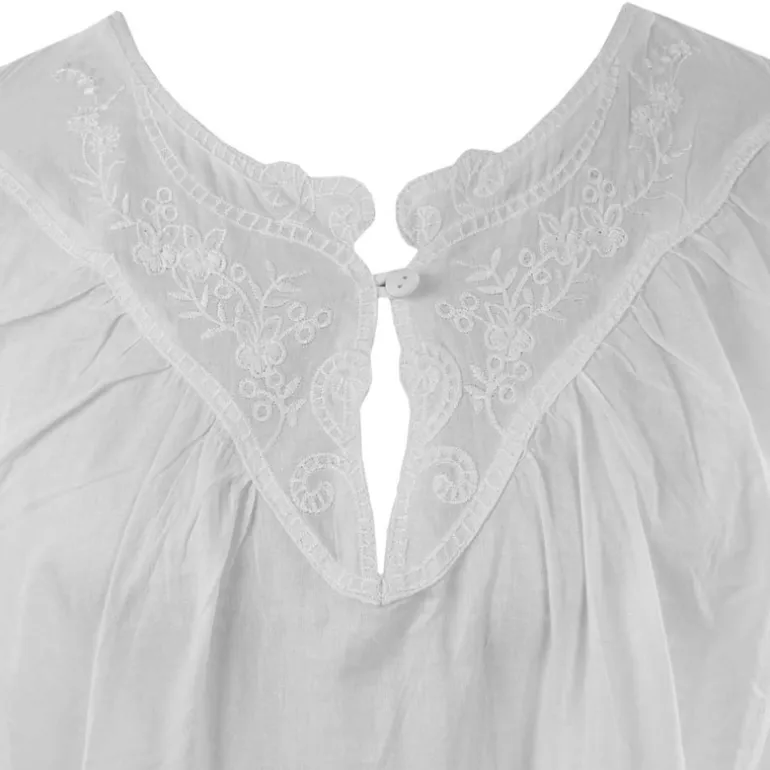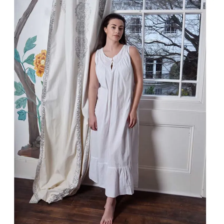 Mouwloosnachthemd van gladde, lichtgewicht witte katoen. Dit model heeft een flatterende hoge halslijn die zowel open als gesloten gedragen kan worden met de knoop- en lussluiting. De halslijn is elegant gevormd, de pasis verfraaid met prachtige witte geborduurde bloemen en bladeren en afgezet met een geborduurde omtreklijn en er is een lusband rond de armsgaten. Het nachthemd plooit zich vanaf de buste en eindigt met een langevolant aan de zoom.