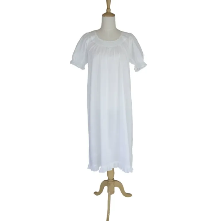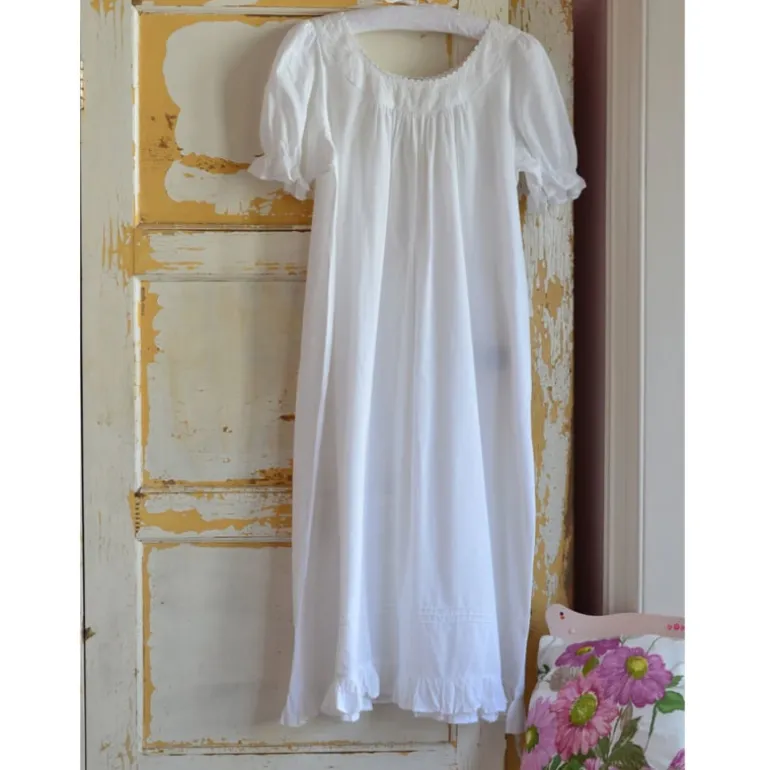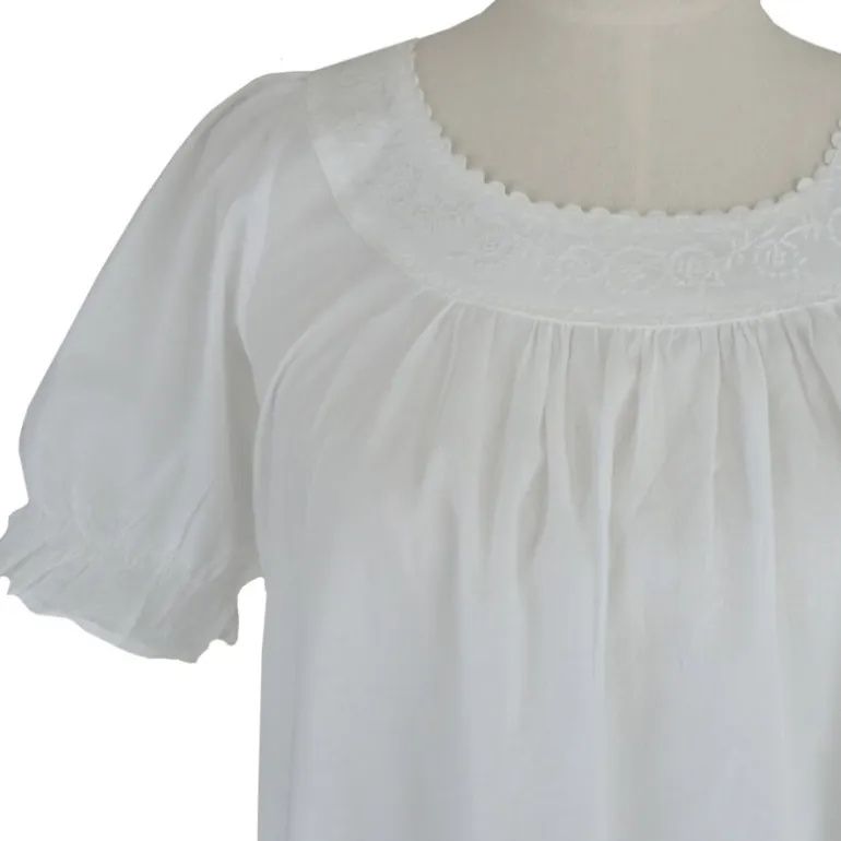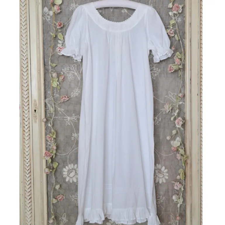 Prachtig romantisch nachthemd met een ronde hals met broderie en afgewerkt met een zigzagbandje. Hoog aangerimpeld dus zit heerlijk, de korte mouw en onderkant zijn afgewerkt met een ruche.