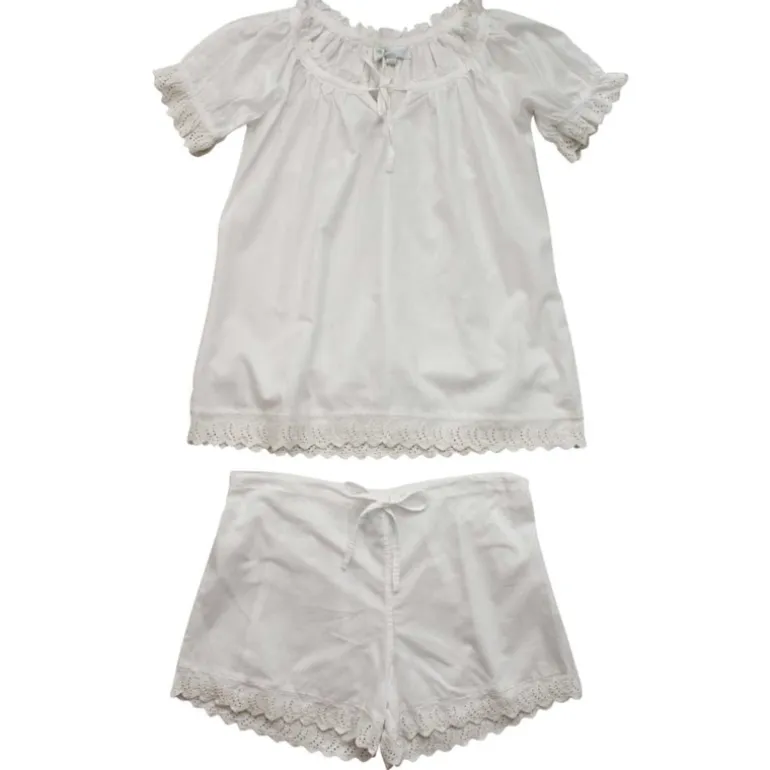 Deze mooie romantische pyjama met korte mouwen en een short is de perfecte stijl voor warmere nachten. De top heeft een mooie geplooide halslijn met broderie anglaise biesjes op de mouwen en zoom. De short heeft een taille met trekkoord voor een comfortabele pasvorm en is afgezet met anglaise broderie-afwerking rond de zomen.