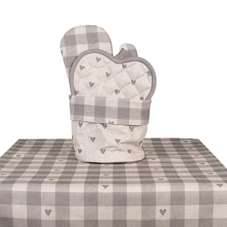 Gemaakt van een katoenen stof met een landelijke ruit gecombineerd met lieflijke hartjes. De serie is verkrijgbaar in de kleuren rood/wit en beige/grijs.