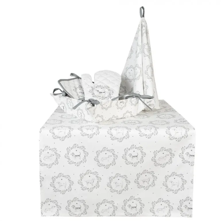 Met deze textielserie Lovely Grey Dog van Clayre & Eef verhoog jede sfeer van elke keuken. Dezeprachtige tijdloze grijs met witte serie, is voorzien van een hondenthema. De vertederende hondenmotieven voegen warmte en karakter toe aan elke keuken, waardoor ze een must-have zijn voor hondenliefhebbers èn iedereen die een smaakvolle keukeninrichting kan waarderen. Ervaar de harmonieuze mix van stijl en functionaliteit; deze textielstukken zoals keukenschort, pannenlap, ovenhandschoen, keukendoeken en tafellopersverbeteren niet alleen de esthetiek van uw keuken, maar zijn tevens enorm praktische toevoegingen. Transformeer de keuken om tot een gastvrije ruimte die de liefde voor honden weerspiegelt door de perfecte combinatie van charme en lieflijke patronen.