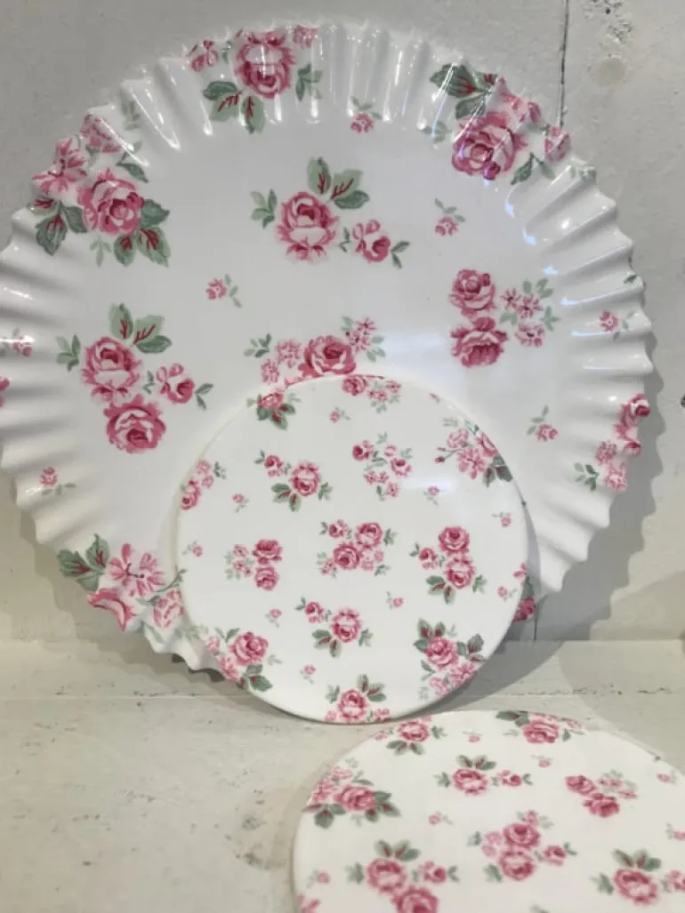 Leuke keramieken pannen onderzetter met een mooie roosjesprint, de onderkant is van kurk en blijft daardoor goed op de tafel liggen.