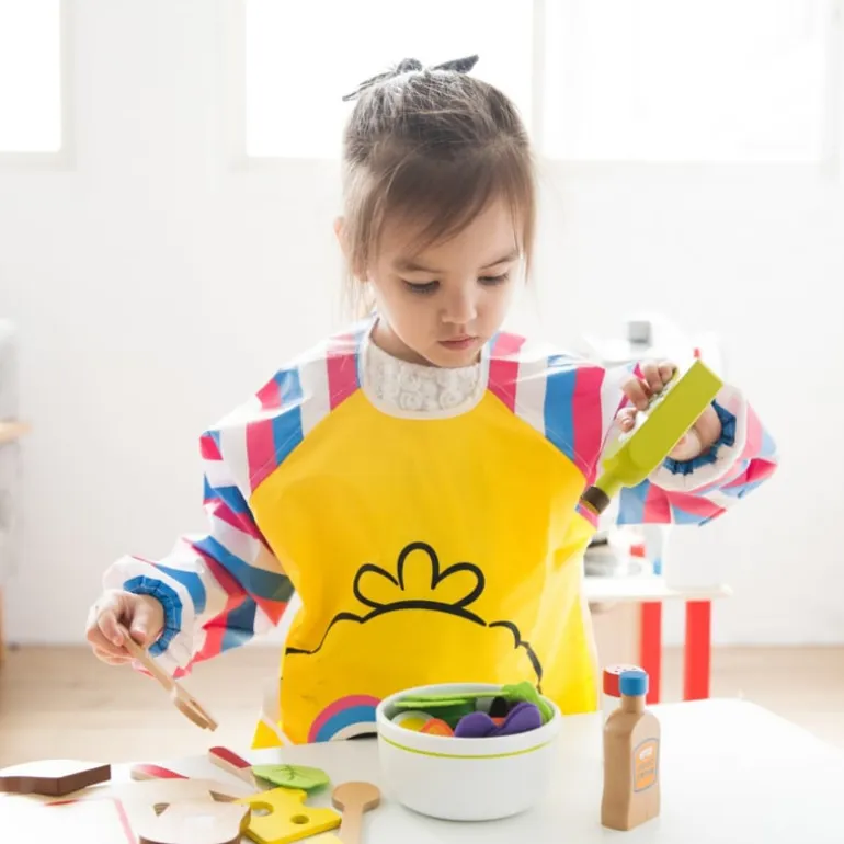Deze mooie set bevat alles wat je nodig hebt om een lekkere salade te maken voor de kleine kok in spé. Varieer met de verschillende soorten groenten, plakjes ei, flesje olie en flesje slasaus en maak iedere keer een andere salade. De slablaadjes zijn van vilt.
