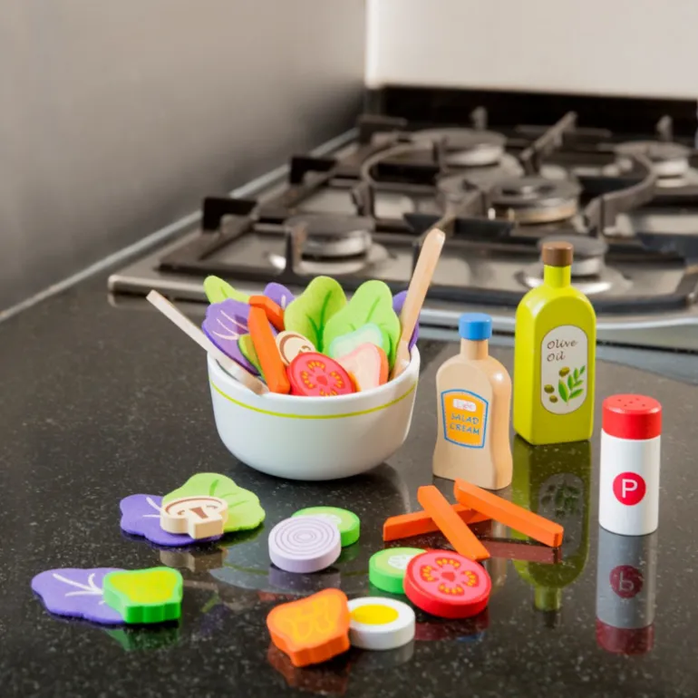 Spelen met deze salade set is zowel leuk als leerzaam en bevordert de creativiteit van kinderen. Deze salade set van New Classic Toys is onderdeel van de Bon Appetit productlijn. Snijden, bakken, koken en aan tafel!