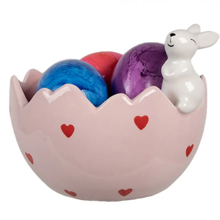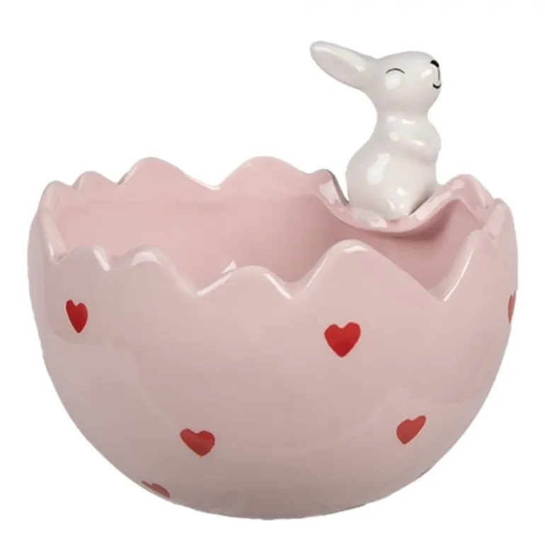 Super leuk schaaltje/kom in de vorm van een half ei. Op de rand zit een wit konijntje en op de kom vind je rode hartjes.