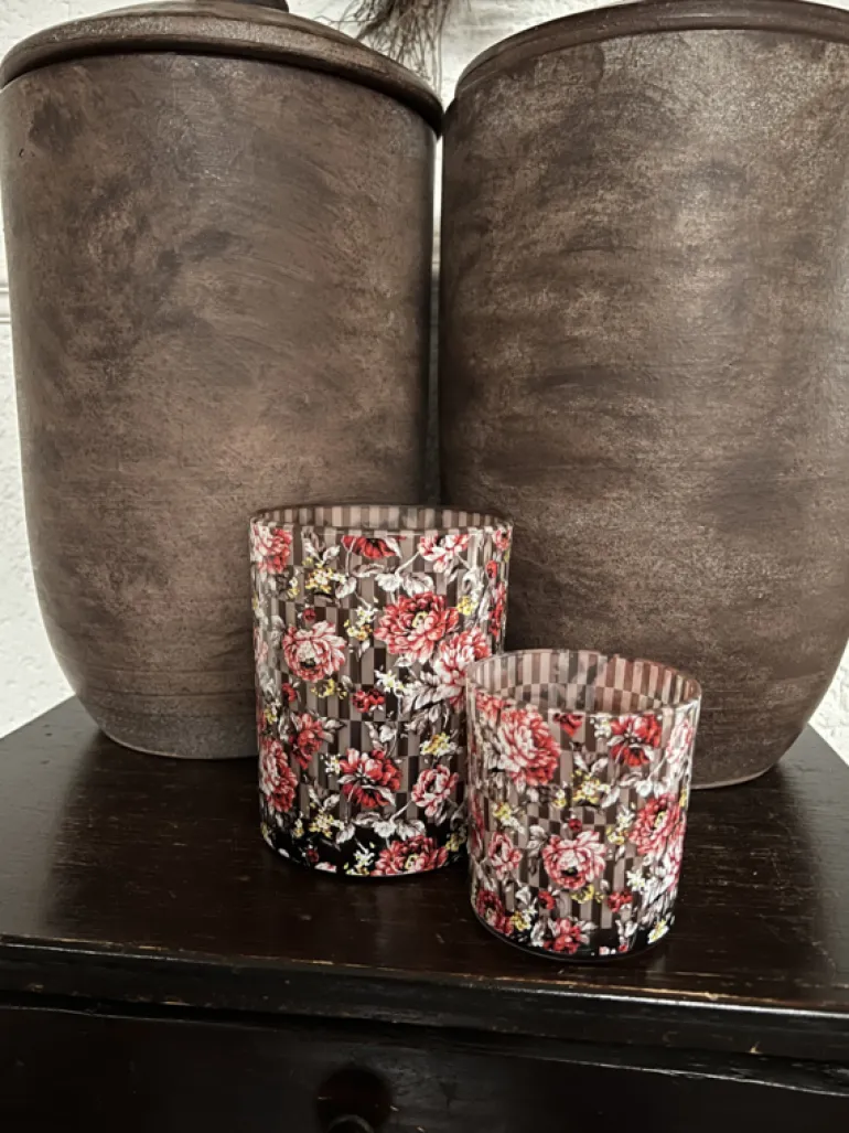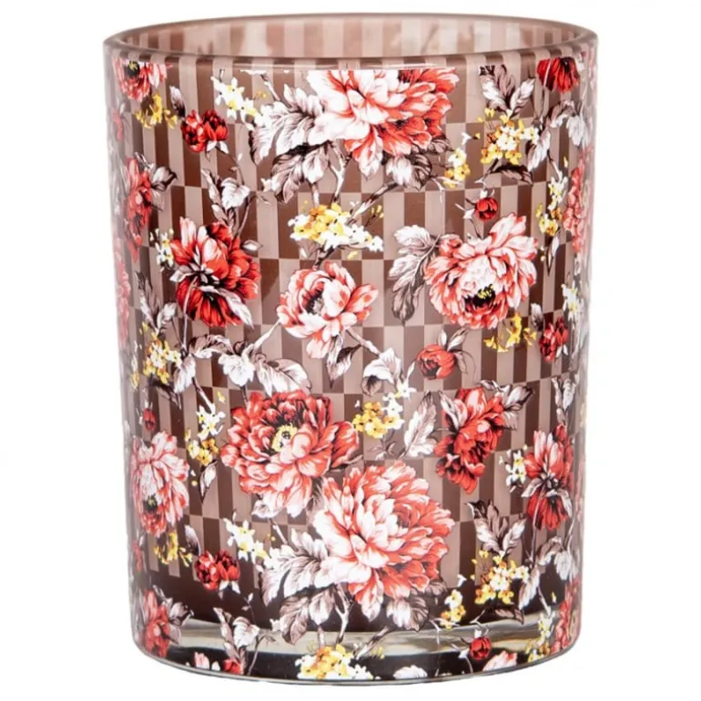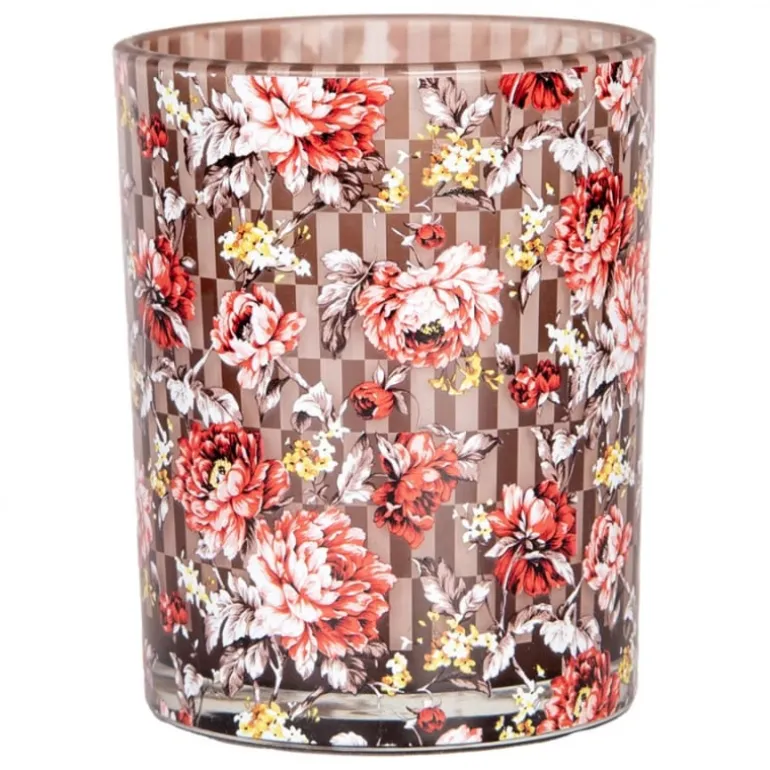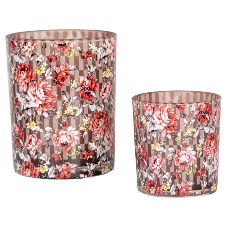 Mooie set van 2 glazen waxinelichthouders met een motief vanfleurige pioenrozen op een bruine geblokte achtergrond!