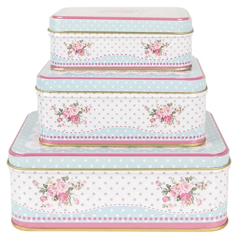 Om kleine spulletjes in op te bergen heb je nooit genoeg! Leuke set met 3 blikken in een romantische stijl, voorzien van roosjes en dots.