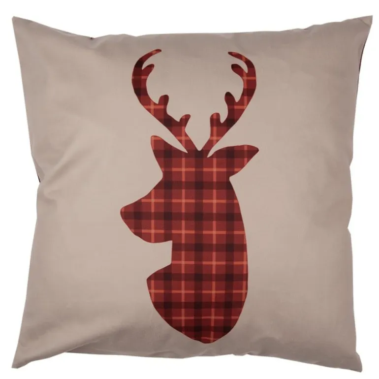 Een mooi decoratief kussen geeft altijd een gezellige warme sfeer in huis. Deze sierkussenhoesmet een prachtig motief van een hert in de geruite stof van de achterkant! Deachterkant van de kussenhoes is gemaakt vaneen rood geruite stof in een landelijke stijl.