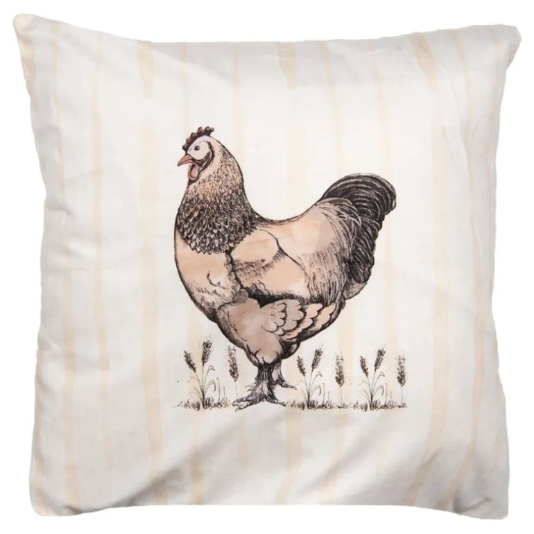 Mooie sierkussenhoesmet een prachtigekip in bruin op een beige gestreepte achtergrond.Leuk als je van kippen houdt of voor in een landelijk interieur!