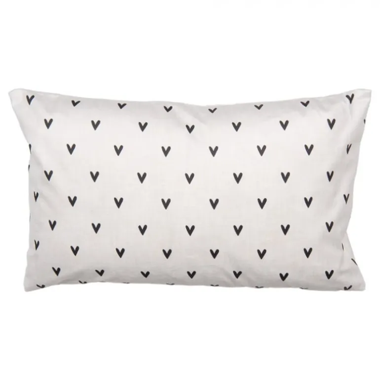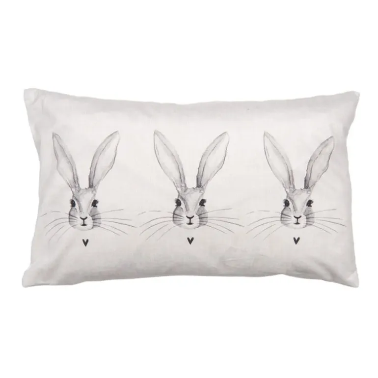 Prachtige sierkussenhoesmet een lieflijke konijnen op een linnenlook achtergrond, ook vind je onder de konijnen een zwart hartje. De achterkant van de kussenhoes heeft een print van enkel hartjes.