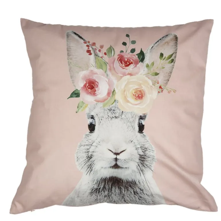 Wat een mooie kussenhoes met een print van een konijn met rozen!