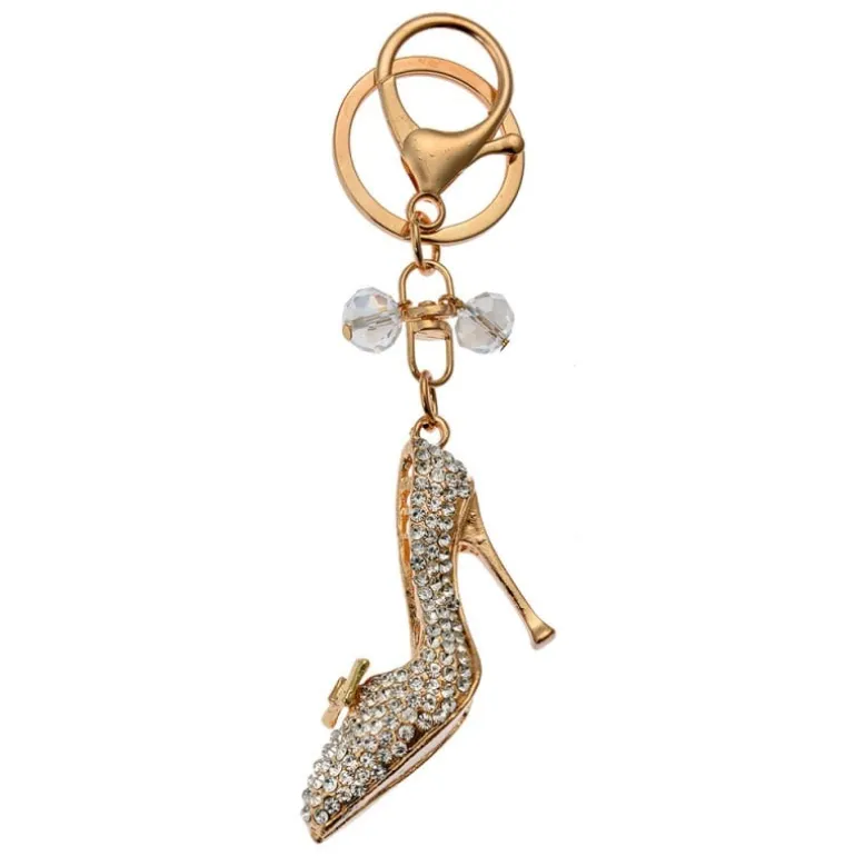 De mooie hanger heeft de vorm van een pump met hoge hak, bezet met allemaal kleine zilverkleurige steentjes. De hanger zelf is goudkleurig.