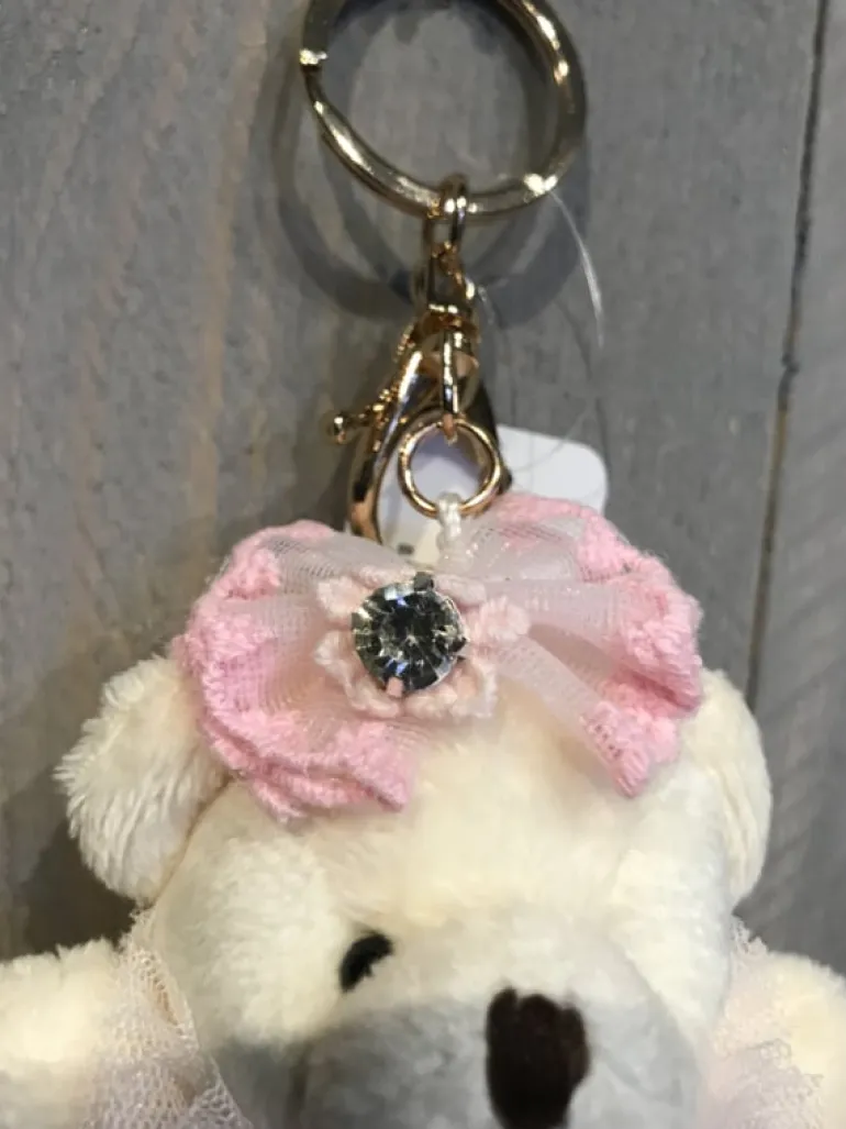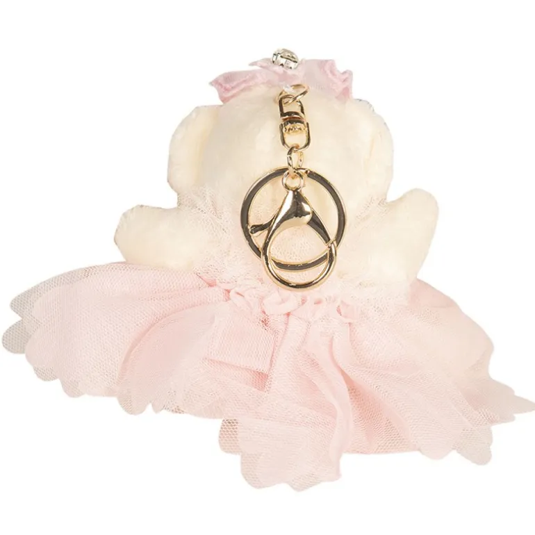 Super leuke en lieve sleutelhanger met een pluche beertje met een roze tule jurkje aan en een broderie strik met een strasssteentje!