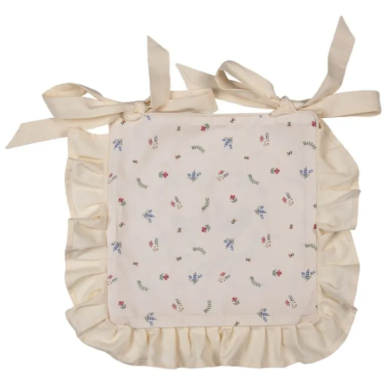 De beige katoenen stof van deze stoelkussenhoesheeft een gezelligeprint van kleine bloemetjes en een kip en haan. Super leuke textielserie voorin de landelijke keuken of eetkamer!