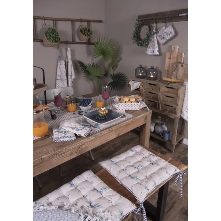 Zoek je een zomerse en gezellige textielserie dan zit je met Blueberry Fields van Clayre & Eef helemaal goed! Zoals de naam al zegt heeft deze textielserie een print met bosbessentakjes en hier en daar een vlindertje. Sommige artikelen zijn afgewerkt met een blauw/beigegestreepte band. De katoenen stofheeft beige als hoofdkleur en wordt gecombineerd met blauwe dots en/of een band metprint van bosbessentakjes. Super leuk om te combineren!