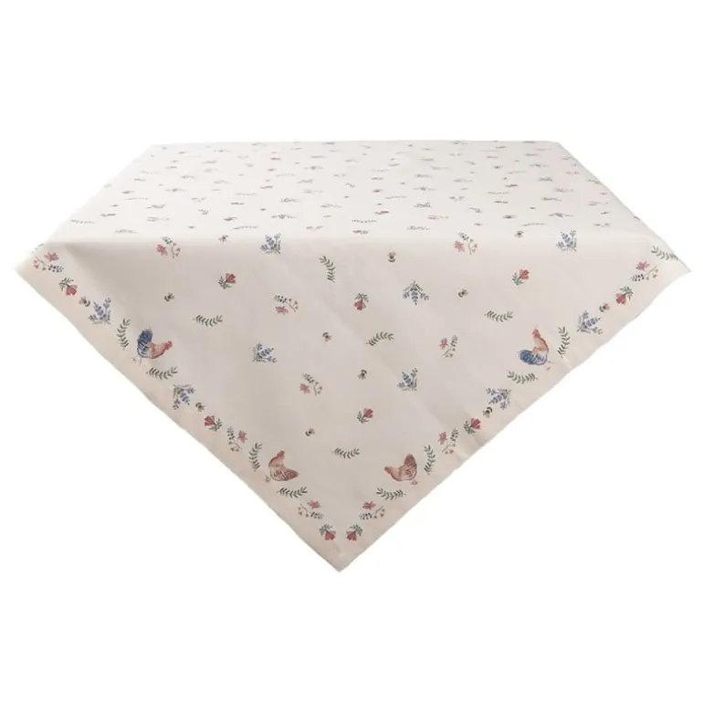 De beige katoenen stof van dit tafelkleed heeft een gezelligeprint van kleine bloemetjes en een kip en haan. Super leuke textielserie voorin de landelijke keuken of eetkamer!