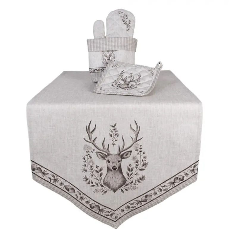 De textielserieGentle Wildernessvan Clayre & Eef in een mooie beige tint brengt een sfeervolle vintage uitstraling naar elke keuken. Versierd met elegante hert-motieven en gedetailleerde planten illustraties, straalt elk item warmte en charme uit. Deze collectie omvat alles wat je nodig hebt om elke keuken instijl te verfraaien. Van prachtige tafelkleden en stijlvolle theedoeken tot praktische schorten en decoratieve placemats. Elk stuk is ontworpen met oog voor detail en kwaliteit, waardoor functionaliteit en esthetiek perfect samengaan. Breng een vleugje nostalgie en natuur in elk interieur met deze unieke en sfeervolle keukencollectie.
