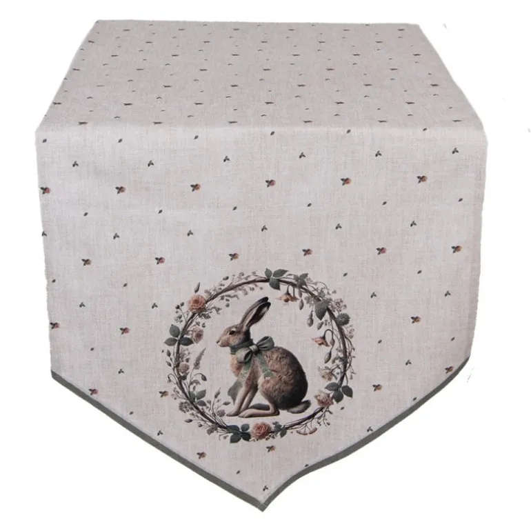 De textielserie is gemaakt van katoenen stof met eenbeige ondergrond en een design van een mooie krans met daarin een haas met een groene strik. De krans heeft allemaal bloemetjes, roosjes en blaadjes. Verspreid over de stof vind je ook kleine roosjes en blaadjes. De meeste items van deze serie zijn afgewerkt met een groene band.