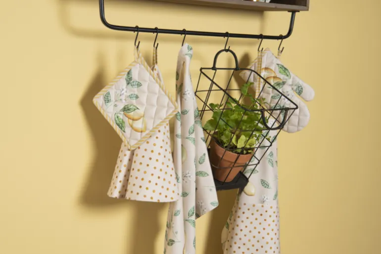 Wat weer een gezellige textielserieLemons and Leafsvan Clayre & Eef! De mooie katoenen stoffen hebben een leukeprint van citroenenen bladeren gecombineerd met een stippelstof. Sommige artikelen van deze serie zijn afgewerkt met een geel gestreepte band.