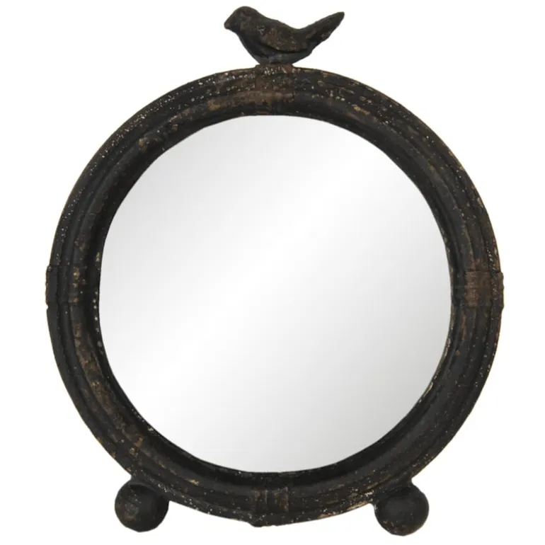 Deze tafel spiegel zet je gemakkelijkop tafel met de uitklapbare steun. De spiegel is oud gemaakt en heeft daardoor een brocante uitstraling. Aan de bovenzijde bevind zich een schattig vogeltje.