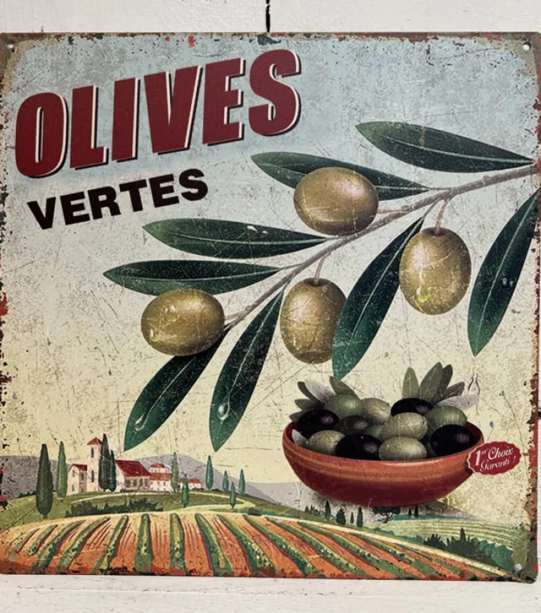 Prachtige en gezellige wandplaat met een print van olijven in een kommetje en olijven aan een takje in een brocante stijl.