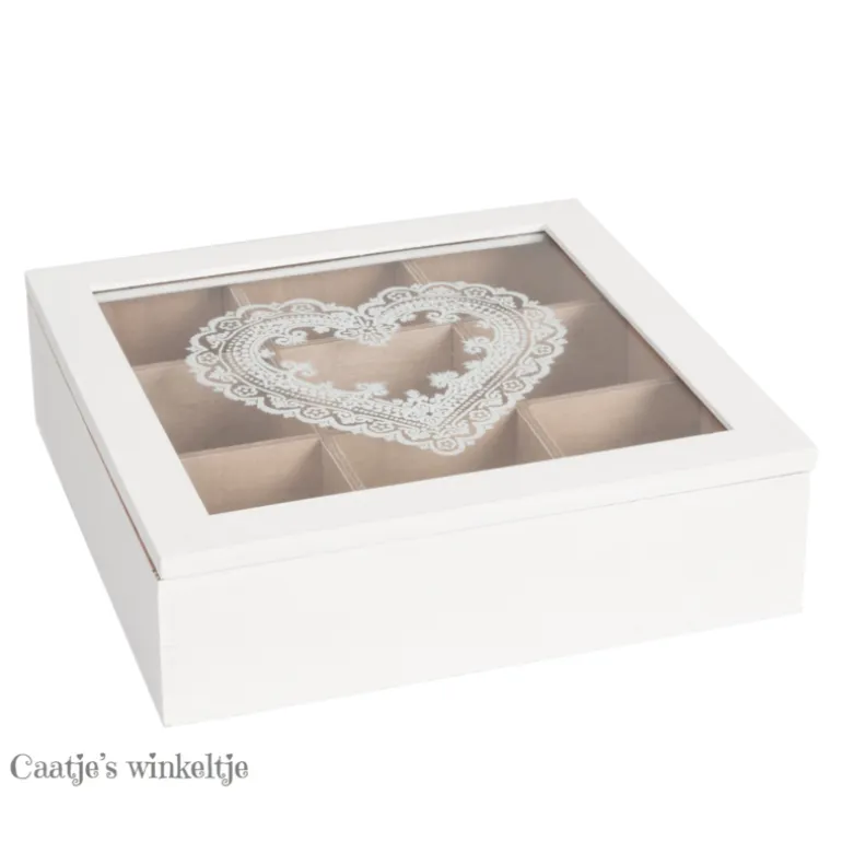 Romantische theedoos met een glazen deksel en 9 vakken om diverse soorten thee in te presenteren. Op het deksel bevind zich een afbeelding van een wit hart. Aan de binnenkant is de theedoos houtkleur.