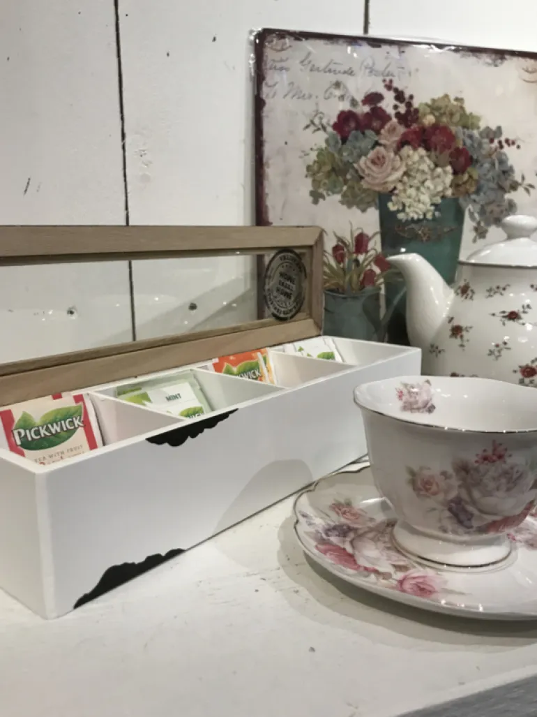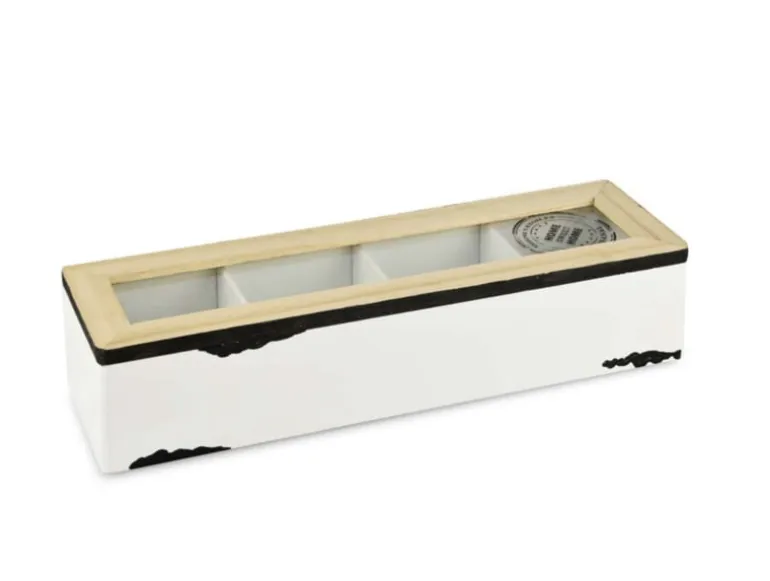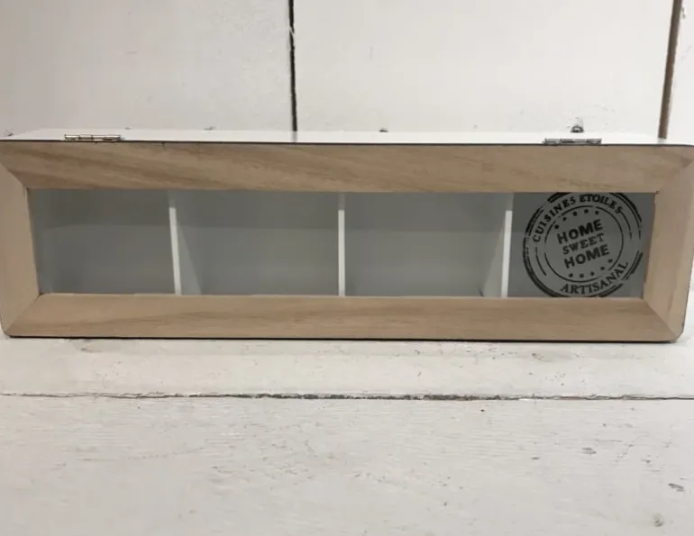 Handige 4-vaks theedoos in een brocante look. De theedoos heeft een glazen deksel met rondom houtkleur en een opdruk met de tekst ‘Home sweet Home’