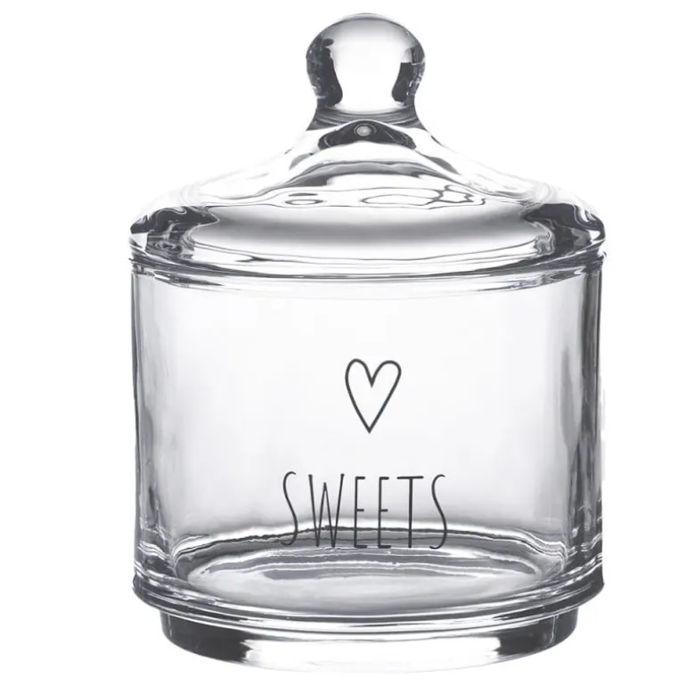 Leuke ronde glazen voorraad of bewaarpot met deksel in een romantische stijl. De opdruk is een hart en de tekst Love.