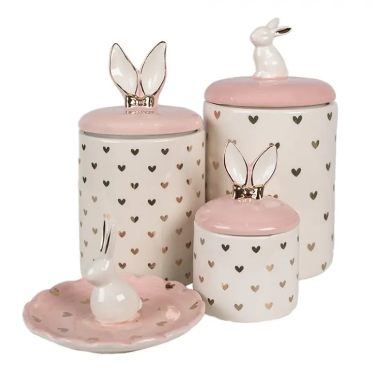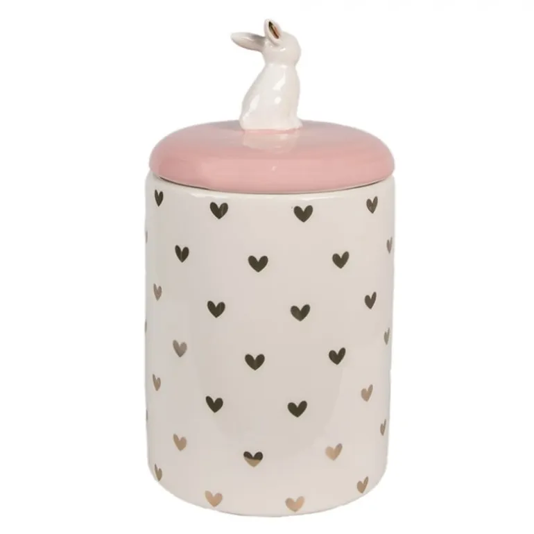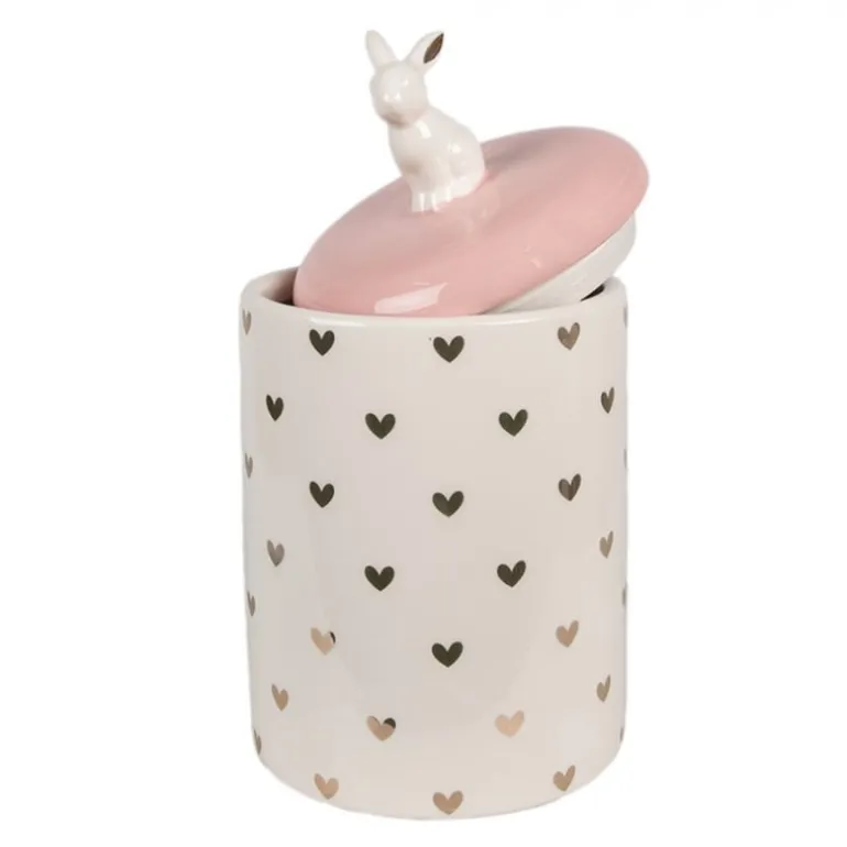 Prachtige voorraad/bewaarpotmet goed afsluitend deksel om bv snoepjes,paaseitjes of andere etenswaar te bewaren. De witte potis voorzien van goudkleurige hartjes en op het roze deksel zit een schattig konijntje met goudkleurige oortjes.
