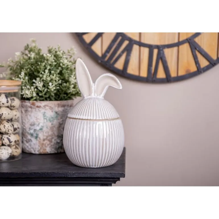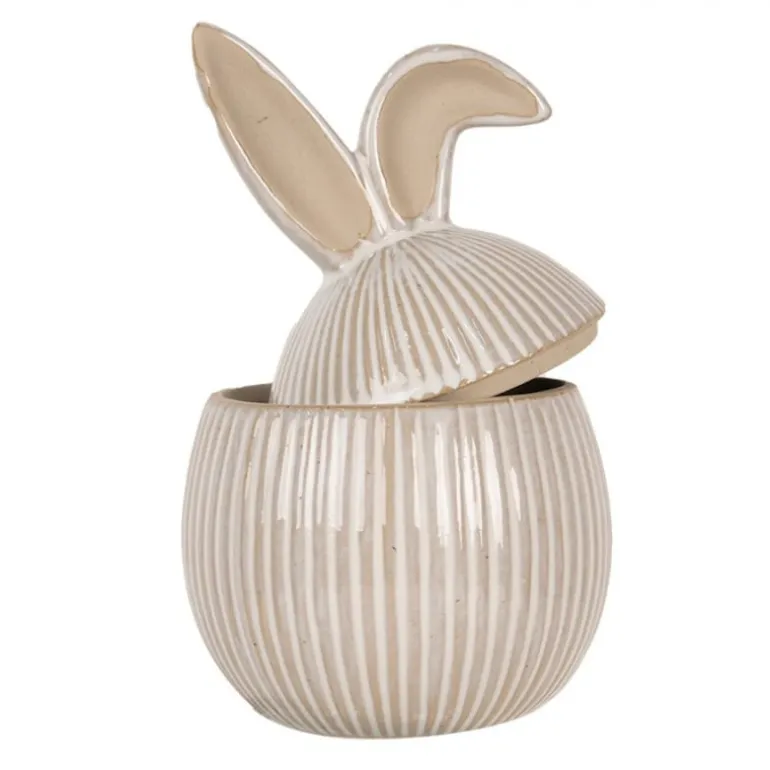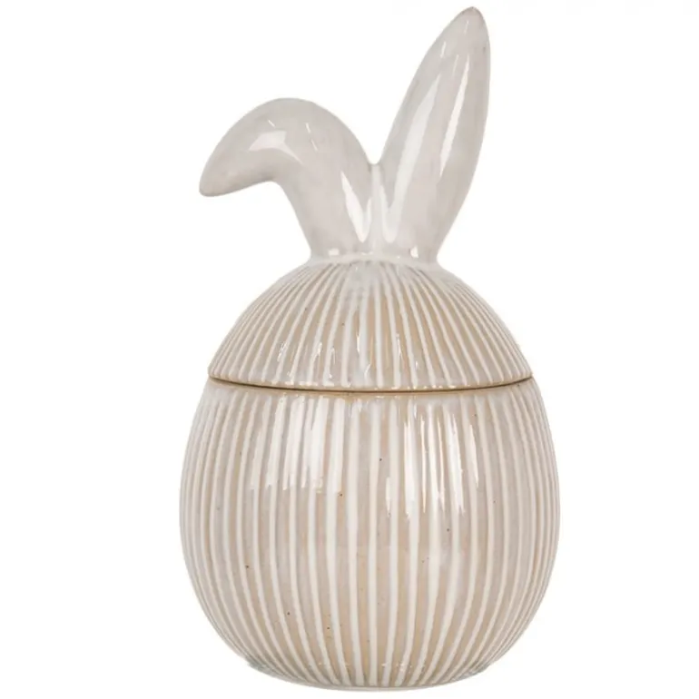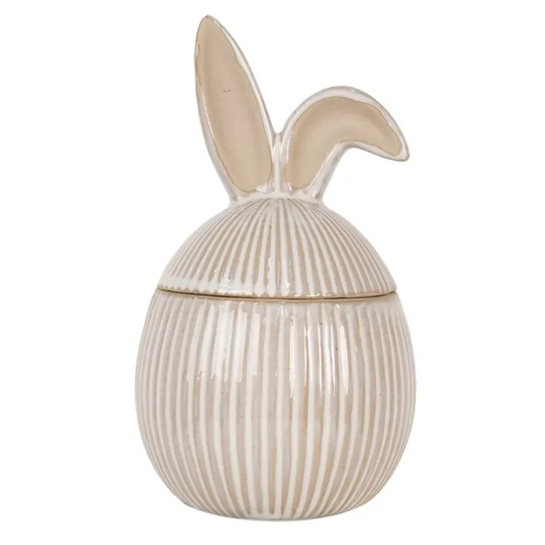 Super leuke bonbonière of voorraadpotmet deksel, in een landelijke stijl. De pot is voorzien van schattige oortjes. Ook perfect om paaseitjes in te bewaren.