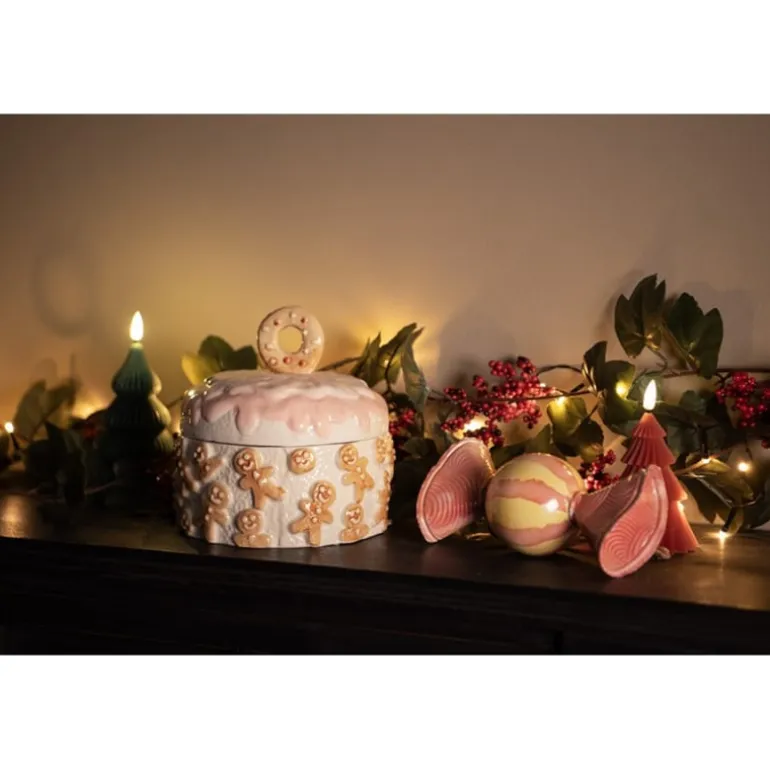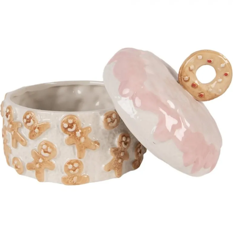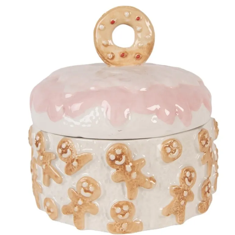 Hoe gezellig deze mooie voorraadpot met deksel in de vorm van een ronde taart met aan de zijkant peperkoekmannetjes en op de deksel een lekkere koek.
