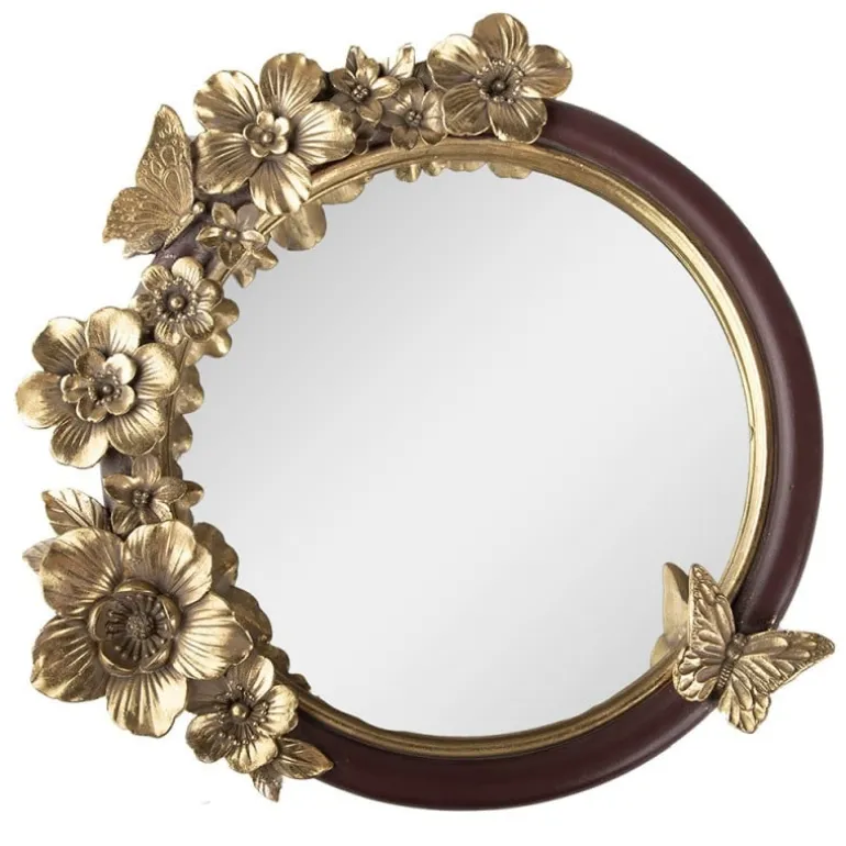 Prachtige ronde spiegel met aan de rand mooie bloemen en een vlinder! De rand van de spiegel is bordeaux rood van kleur met een goudkleurig randje en de bloemen en vlinder zijn ook goudkleurig.