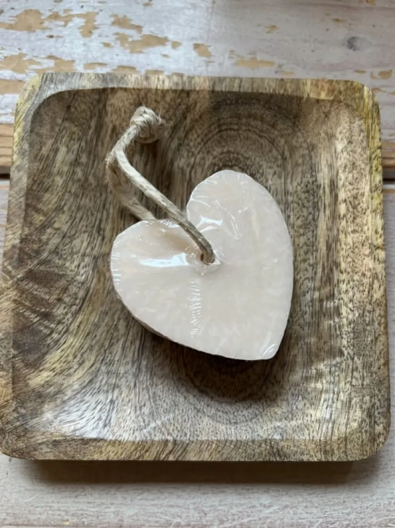Heerlijk stuk zeep in een hartvorm bevestigd aan een touw waarmee je de zeep op kunt hangen bv in een kast bij het fonteintje op het toilet of in de badkamer. Staat decoratief en ruikt lekker!