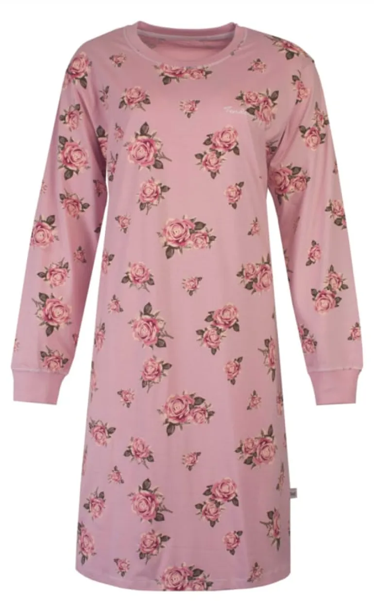 Dit dames nachthemd is van het merk Tenderness en isgemaakt van 100 % gekamde Katoen. Hetnachthemd is gemaakt in een draagbare en rekbare jersey kwaliteit. Het geheel met roosjes geprinte nachthemd heeft een ronde hals met een rekbaar boordje. De hals is afgewerkt met een flatlock steek. Merknaam geborduurd op de borst. Lange mouwen met fijne boorden.