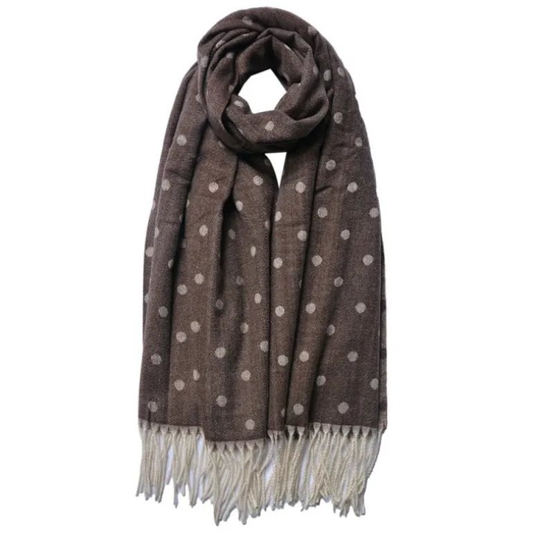 Deze mooie wintersjaal van het merk Juleeze is een stijlvolle accessoire dat je warm houdt op koudere dagen. De sjaal heeft een elegante bruinekleur met een speels stippenmotief en daardoor een perfecte aanvulling op elke winteroutfit.