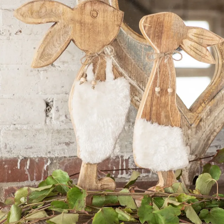 Super leuk deze houten decoratie konijn metaan 1 zijde een zacht “rokje” en om de hals een touwtje met 2 kraaltjes.