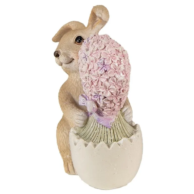 Decoratief lief beeldje van een konijn met een hart in een half ei. Het hart is voorzienvan kleine roze bloemetjes.