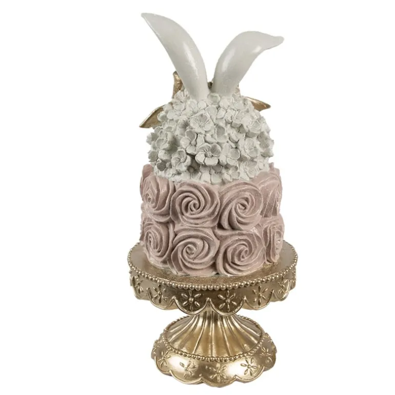 Een prachtige decoratie taart waar je zo aan zou kunnen beginnen! De taart staat op een goudkleurig plateau heeft roze “slagroom” met daarboven kleine witte bloemetjes. Bovenop de taart vind je konijnen oren met een goudkleurig strikje.
