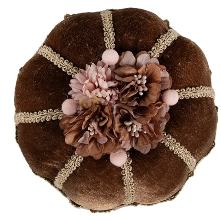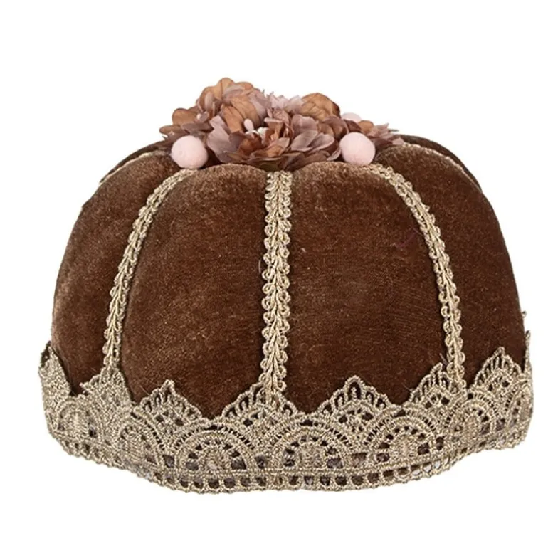 Schattige decoratie taart gemaakt van kunststof bekleed met textiel. Er is een mooie bruine stof gebruikt en afgewerkt met goudkleurig kant en band. Op de bovenkant vind je mooie bloemen!