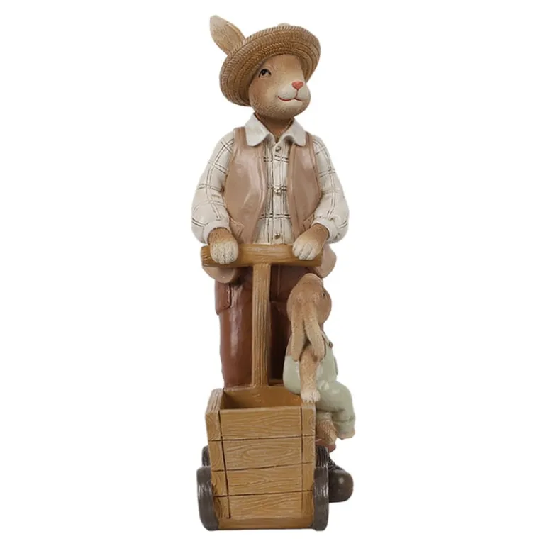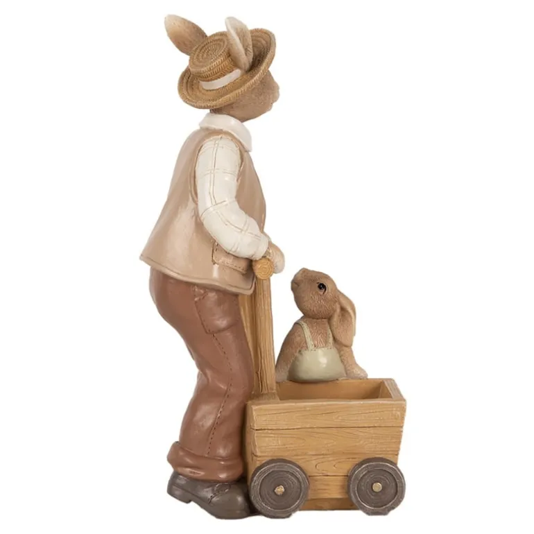 Een schattige decoratie deze vader konijn met hoedje en gilet staand bij een ‘houten’ kar met daarop een klein jongens konijntje.In de kar kan eventueel nog een klein plantjeingezet worden of vullen met paaseitjes.