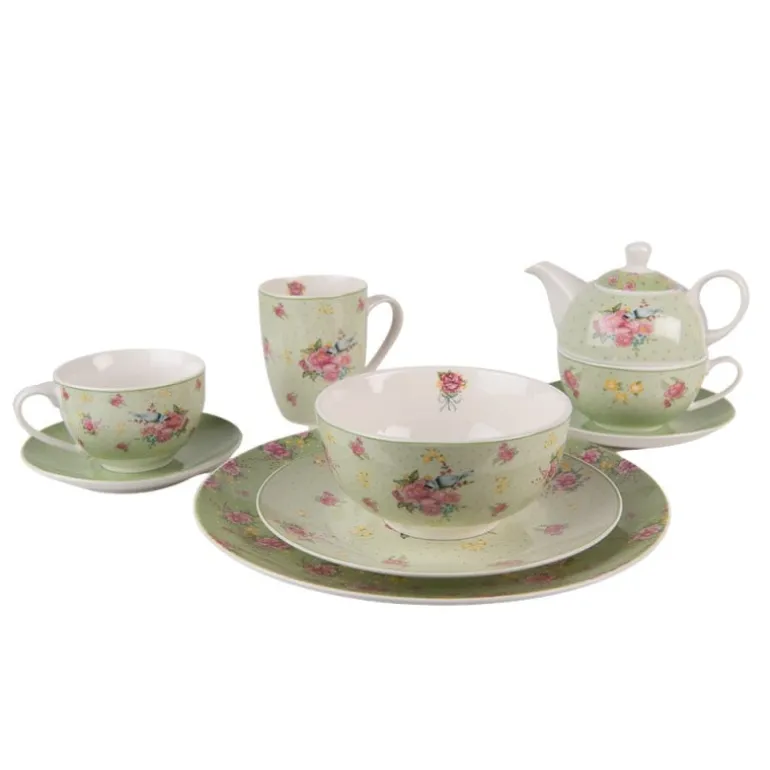 Mooie landelijke groen met beige porseleinen diner bord met opdruk van roze bloemen. Maak het servies compleet door het te combineren met de rest van het servies uit deze serie.
